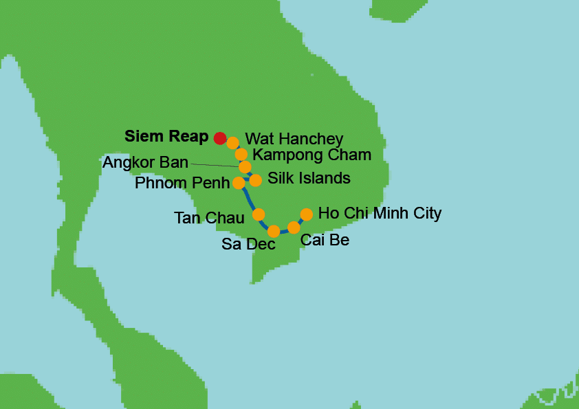 Siem Reap, een badplaats in het noordwesten van Cambodja, is de toegangspoort tot de ruïnes van Angkor, de zetel van het Khmer-koninkrijk uit de 9e tot 15e eeuw. Het enorme complex van ingewikkelde stenen gebouwen van Angkor omvat de bewaard gebleven Angkor Wat, de belangrijkste tempel, afgebeeld op de vlag van Cambodja. Reusachtige, mysterieuze gezichten zijn uitgehouwen in de Bayon-tempel in Angkor Thom.